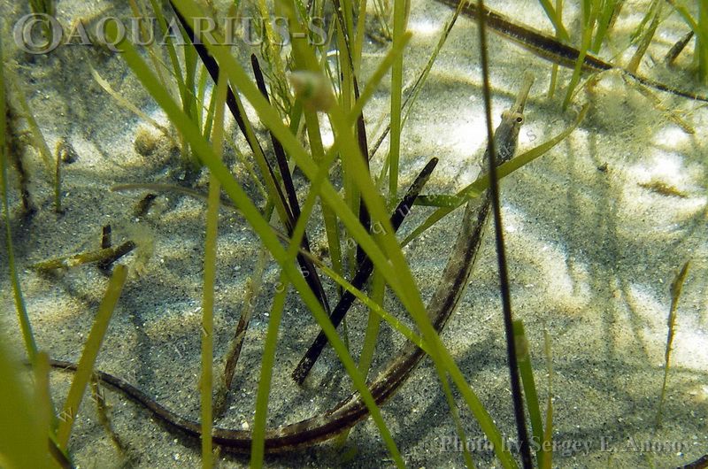 Чёрное море Пухлощекая рыба-игла (Black-striped pipefish). Фото в природе. Таманский залив.